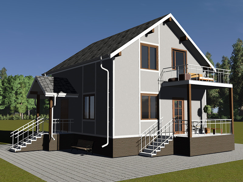Простой в строительстве дом с двускатной крышей, подойдет, также, для узкого участка.
